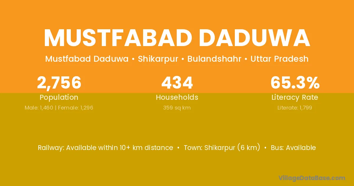 Shikarpur (6 km) is the nearest town to Mustfabad Daduwa village for major economic activities and is located approximately 6 km away.