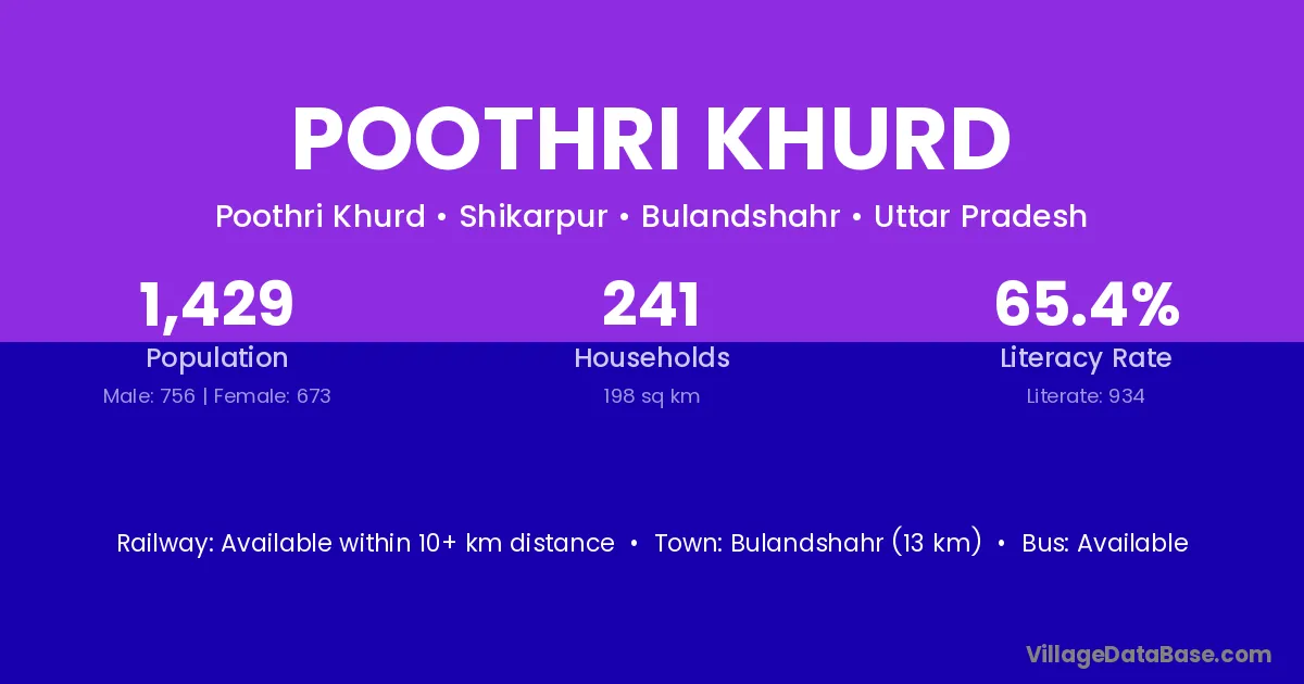 Bulandshahr (13 km) is the nearest town to Poothri Khurd village for major economic activities and is located approximately 13 km away.