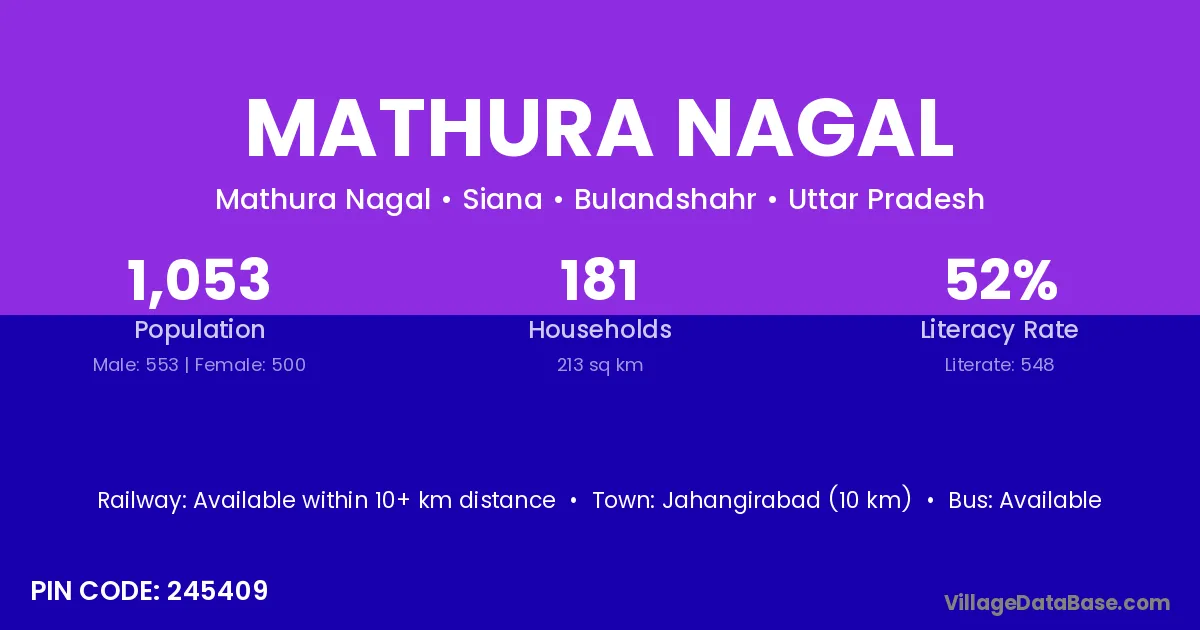 Jahangirabad (10 km) is the nearest town to Mathura Nagal village for major economic activities and is located approximately 10 km away.