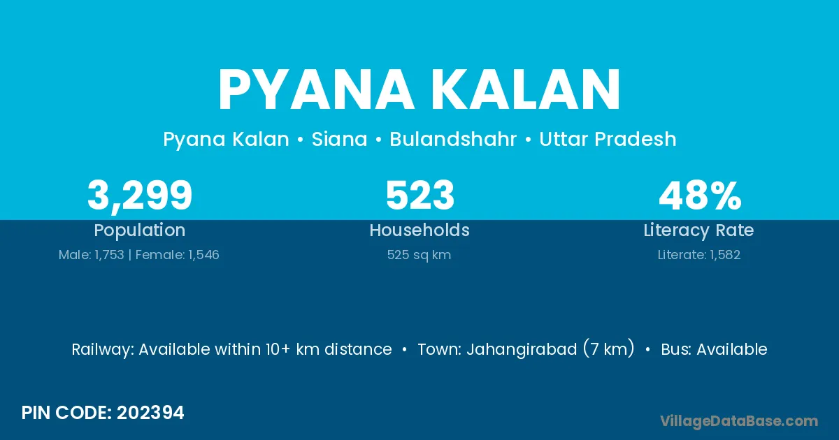 Jahangirabad (7 km) is the nearest town to Pyana Kalan village for major economic activities and is located approximately 7 km away.
