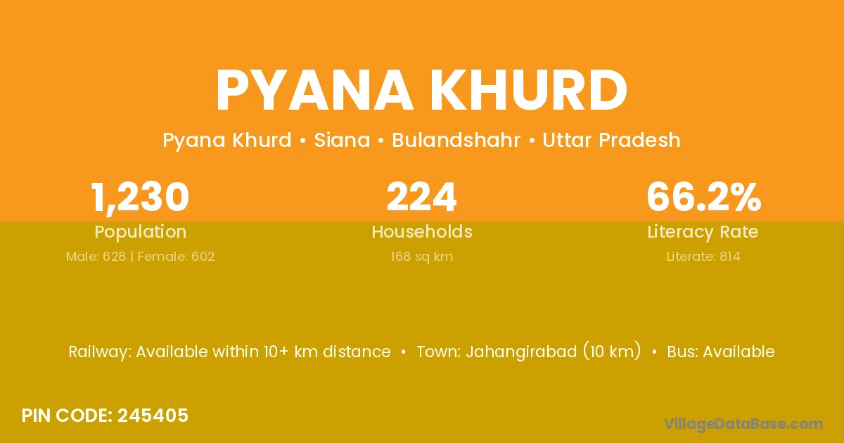 Jahangirabad (10 km) is the nearest town to Pyana Khurd village for major economic activities and is located approximately 10 km away.