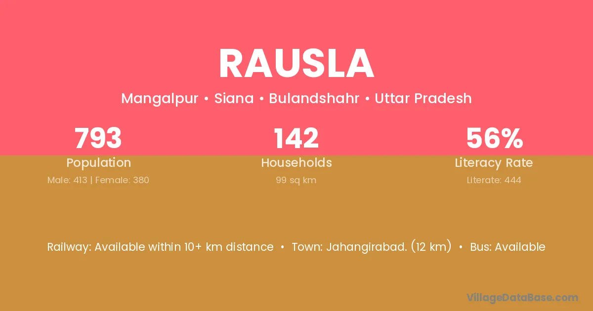 Jahangirabad. (12 km) is the nearest town to Rausla village for major economic activities and is located approximately 12 km away.
