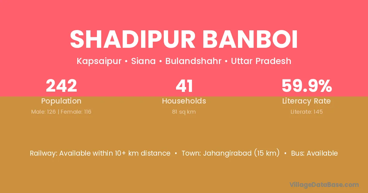 Jahangirabad (15 km) is the nearest town to Shadipur Banboi village for major economic activities and is located approximately 15 km away.