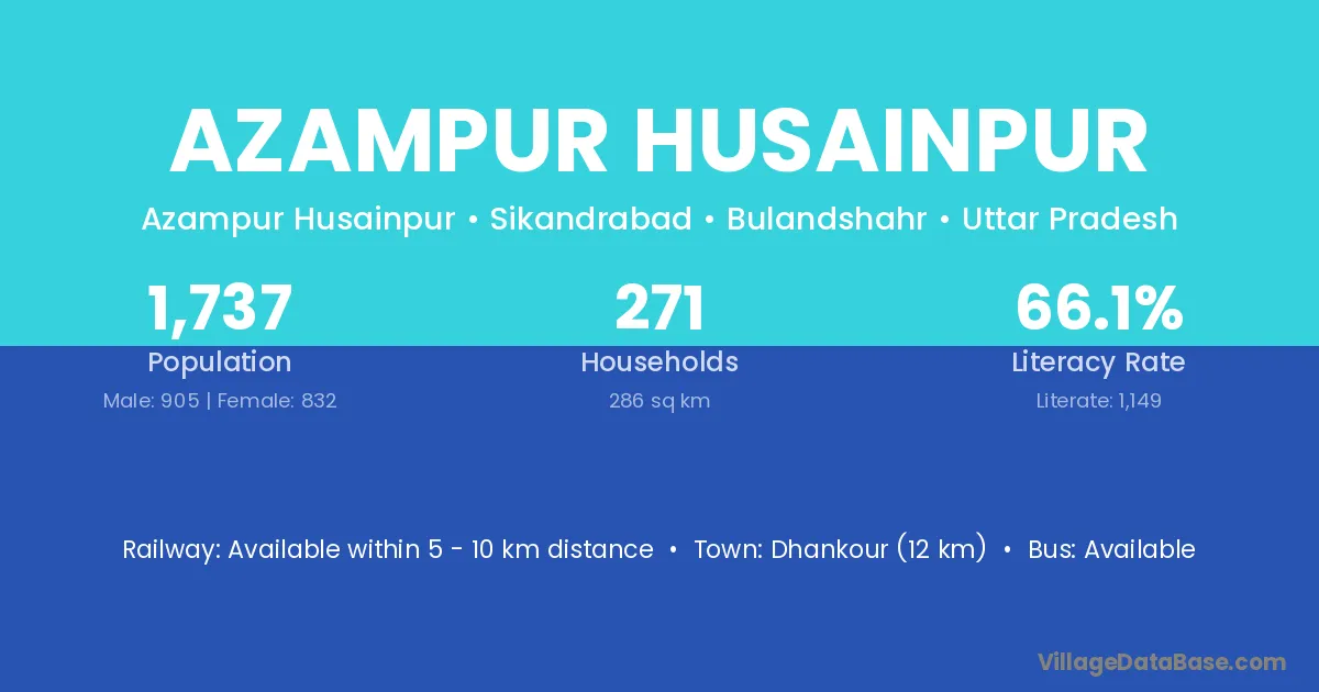 Dhankour (12 km) is the nearest town to Azampur Husainpur village for major economic activities and is located approximately 12 km away.
