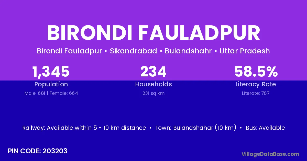 Bulandshahar (10 km) is the nearest town to Birondi Fauladpur village for major economic activities and is located approximately 10 km away.