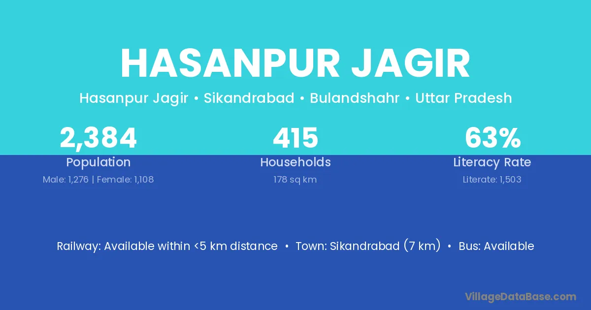 Sikandrabad (7 km) is the nearest town to Hasanpur Jagir village for major economic activities and is located approximately 7 km away.