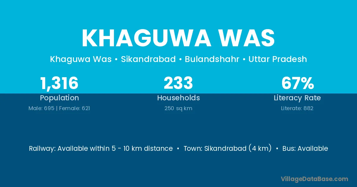 Khaguwa Was village has a total population of 1,316 people, of which 695 are males and 621 are females.