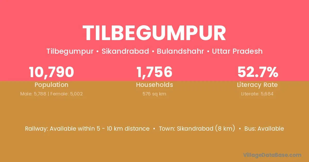 Sikandrabad (8 km) is the nearest town to Tilbegumpur village for major economic activities and is located approximately 8 km away.