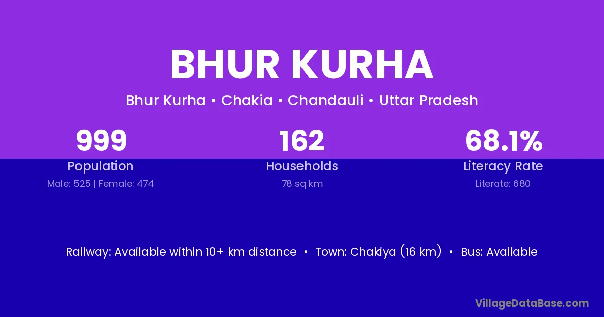 Chakiya (16 km) is the nearest town to Bhur Kurha village for major economic activities and is located approximately 16 km away.