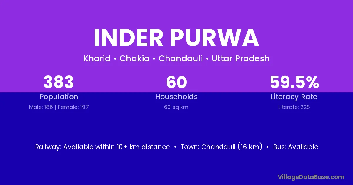 Chandauli (16 km) is the nearest town to Inder Purwa village for major economic activities and is located approximately 16 km away.