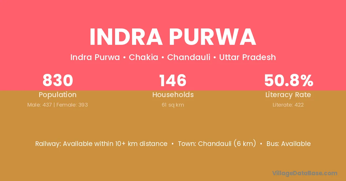 Chandauli (6 km) is the nearest town to Indra Purwa village for major economic activities and is located approximately 6 km away.