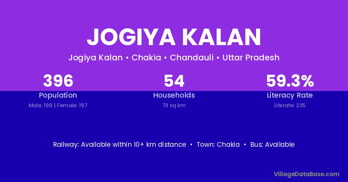 Jogiya Kalan village has a total population of 396 people, of which 199 are males and 197 are females.
