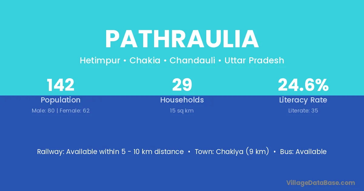Pathraulia village has a total population of 142 people, of which 80 are males and 62 are females.