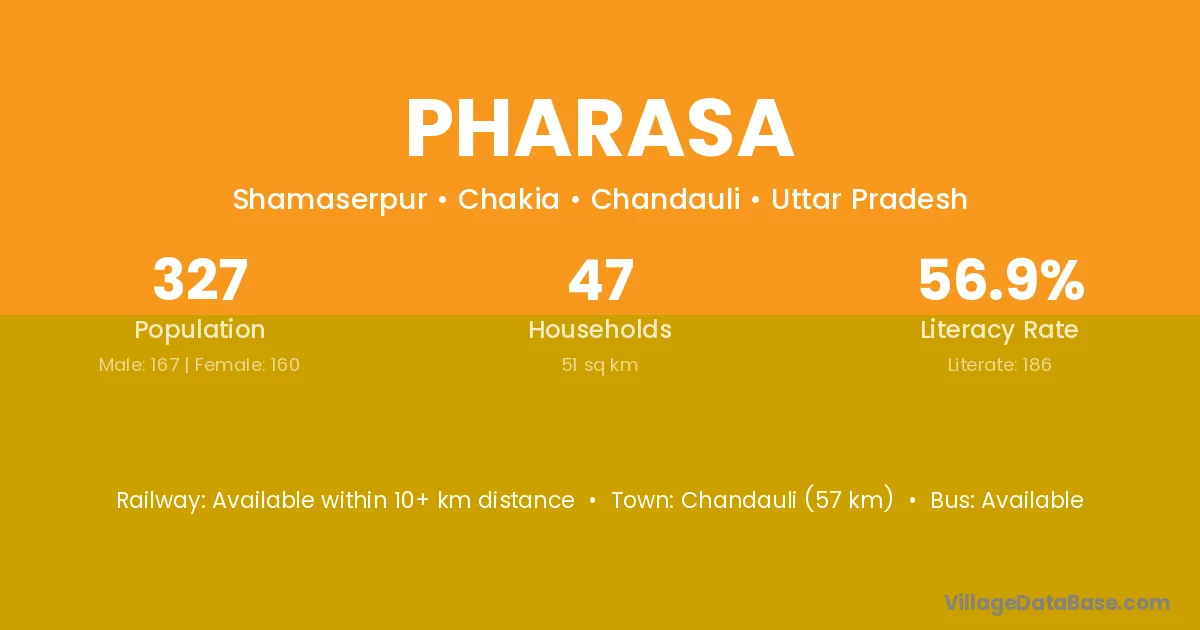 Chandauli (57 km) is the nearest town to Pharasa village for major economic activities and is located approximately 57 km away.
