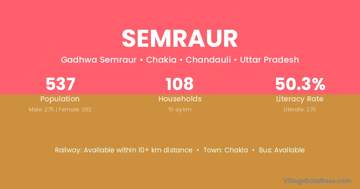 Semraur village has a total population of 537 people, of which 275 are males and 262 are females.