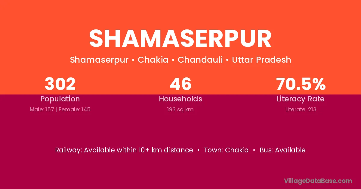 Shamaserpur village has a total population of 302 people, of which 157 are males and 145 are females.