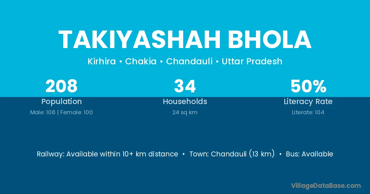 Chandauli (13 km) is the nearest town to Takiyashah Bhola village for major economic activities and is located approximately 13 km away.