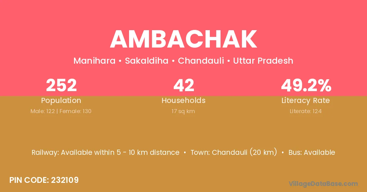 Chandauli (20 km) is the nearest town to Ambachak village for major economic activities and is located approximately 20 km away.