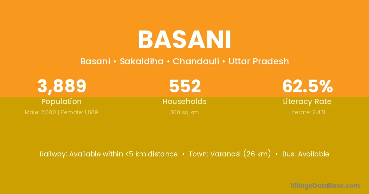 Varanasi (26 km) is the nearest town to Basani village for major economic activities and is located approximately 26 km away.