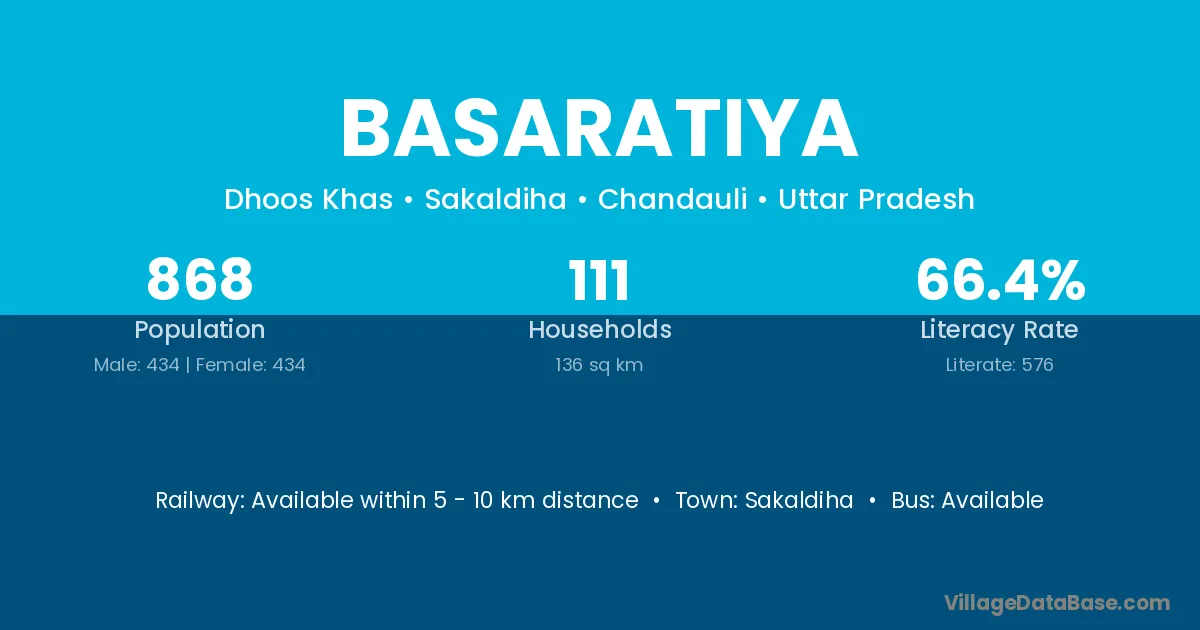 Basaratiya village has a total population of 868 people, of which 434 are males and 434 are females.