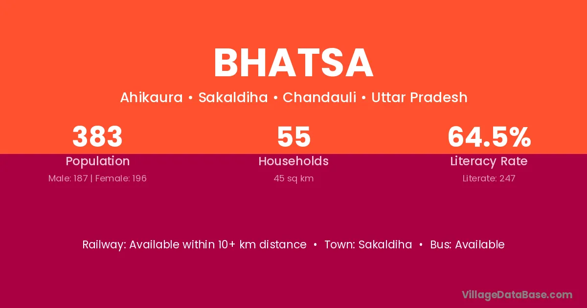 Bhatsa village has a total population of 383 people, of which 187 are males and 196 are females.