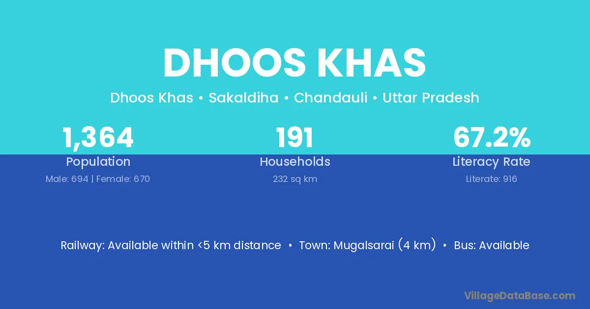 Mugalsarai (4 km) is the nearest town to Dhoos Khas village for major economic activities and is located approximately 4 km away.