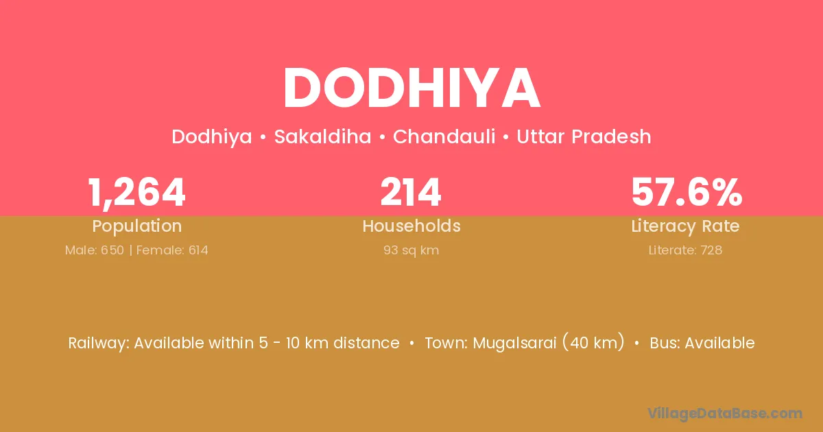 Mugalsarai (40 km) is the nearest town to Dodhiya village for major economic activities and is located approximately 40 km away.