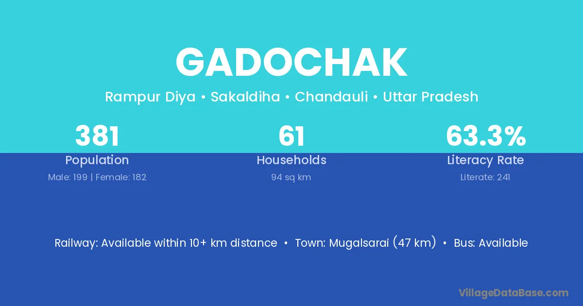 Mugalsarai (47 km) is the nearest town to Gadochak village for major economic activities and is located approximately 47 km away.