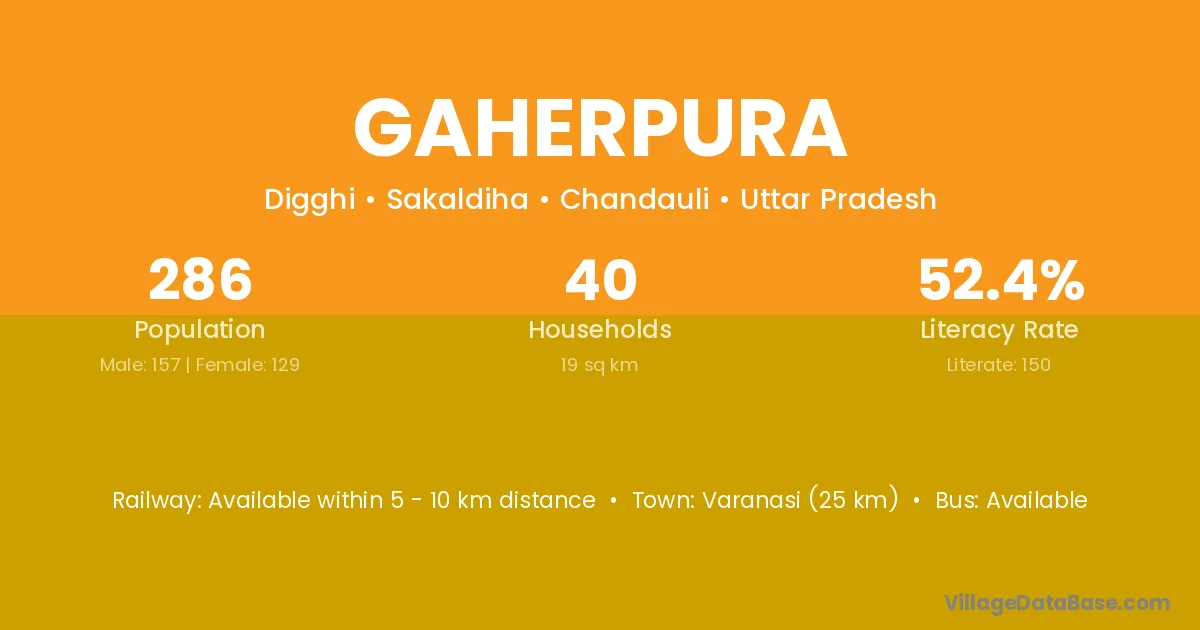 Varanasi (25 km) is the nearest town to Gaherpura village for major economic activities and is located approximately 25 km away.