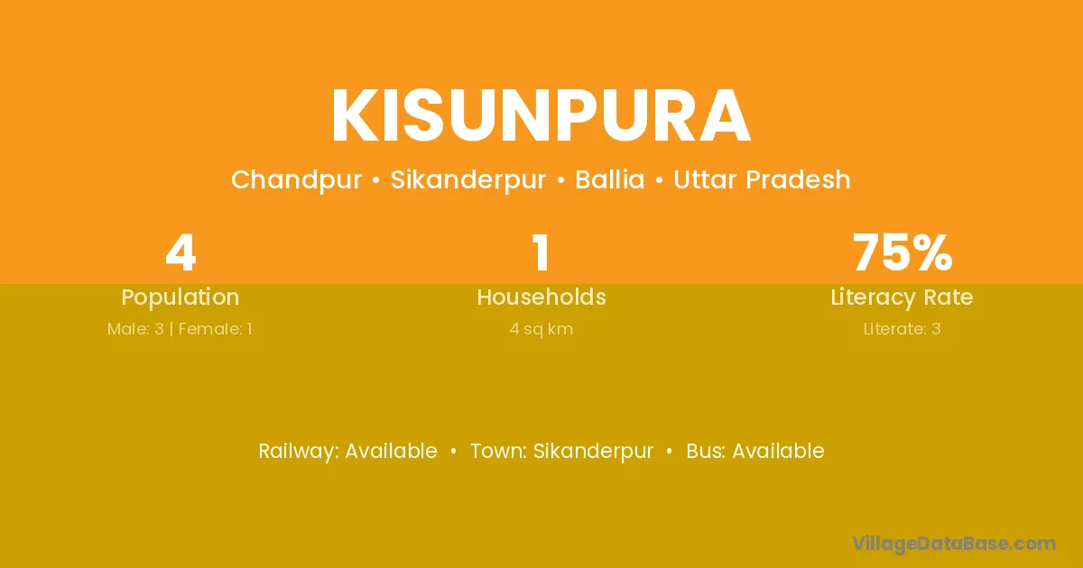 Varanasi (50 km) is the nearest town to Kisunpura village for major economic activities and is located approximately 50 km away.