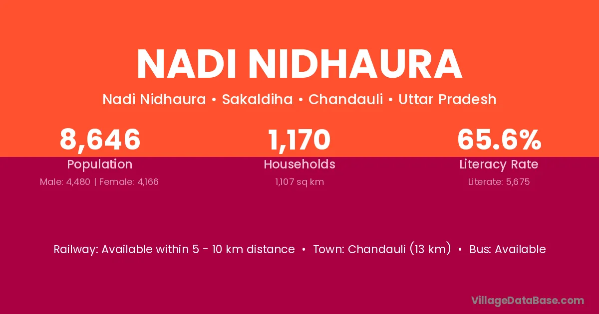 Chandauli (13 km) is the nearest town to Nadi Nidhaura village for major economic activities and is located approximately 13 km away.