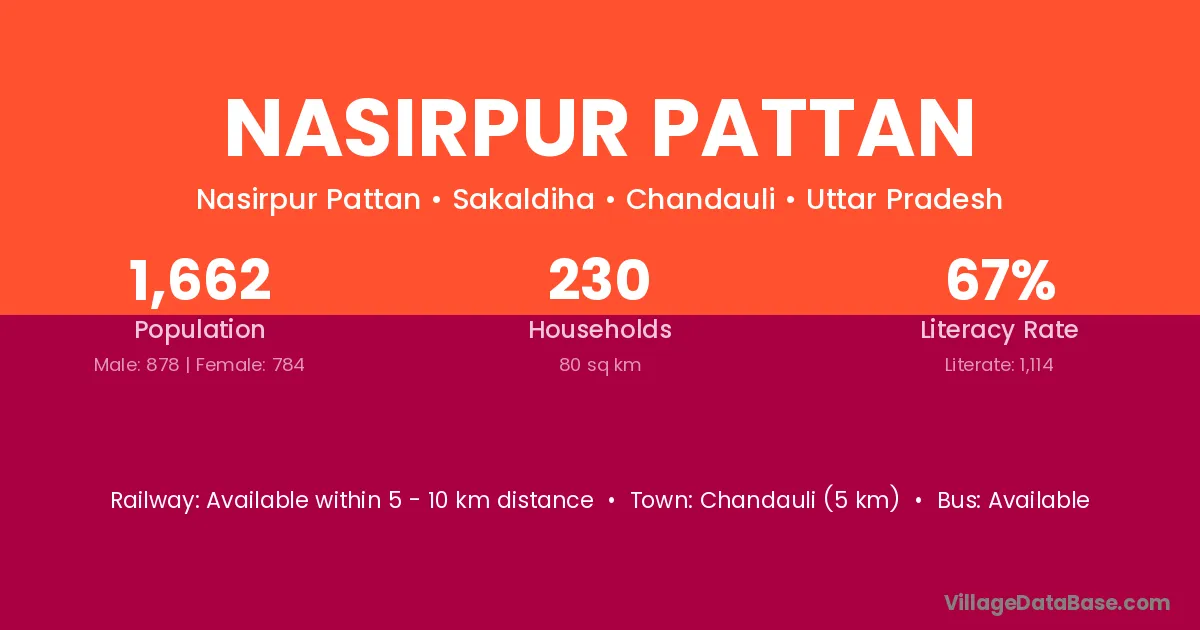 Chandauli (5 km) is the nearest town to Nasirpur Pattan village for major economic activities and is located approximately 5 km away.