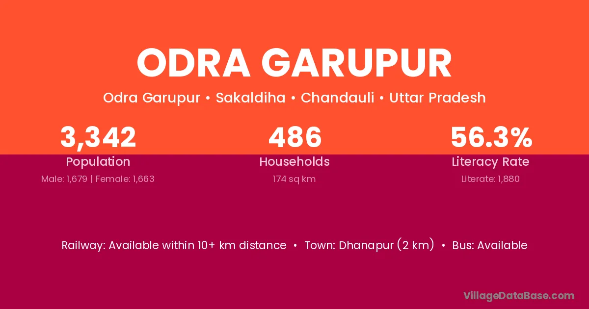 Odra Garupur village has a total population of 3,342 people, of which 1,679 are males and 1,663 are females.