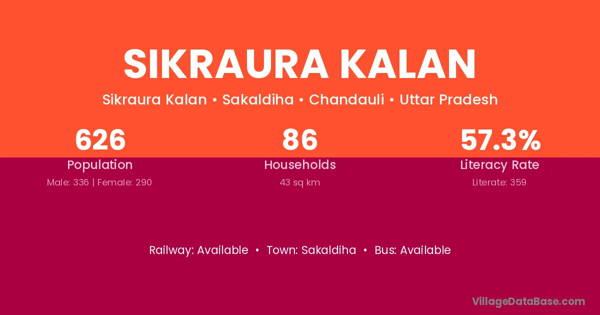 Sikraura Kalan village has a total population of 626 people, of which 336 are males and 290 are females.