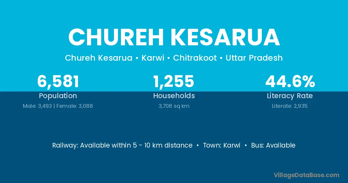 Chureh Kesarua village has a total population of 6,581 people, of which 3,493 are males and 3,088 are females.