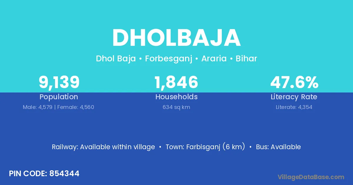 The literacy rate of Dholbaja village is 51.69%. Male literacy stands at 66.42% and female literacy at 34.89%.