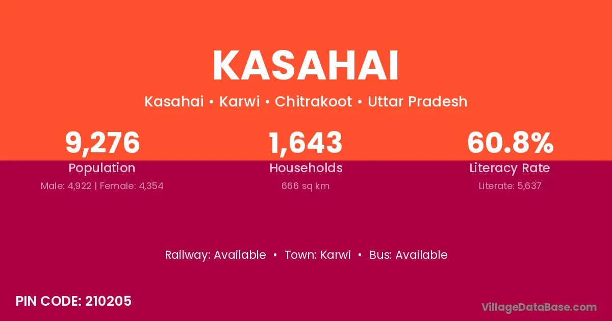 Kasahai village has a total population of 9,276 people, of which 4,922 are males and 4,354 are females.