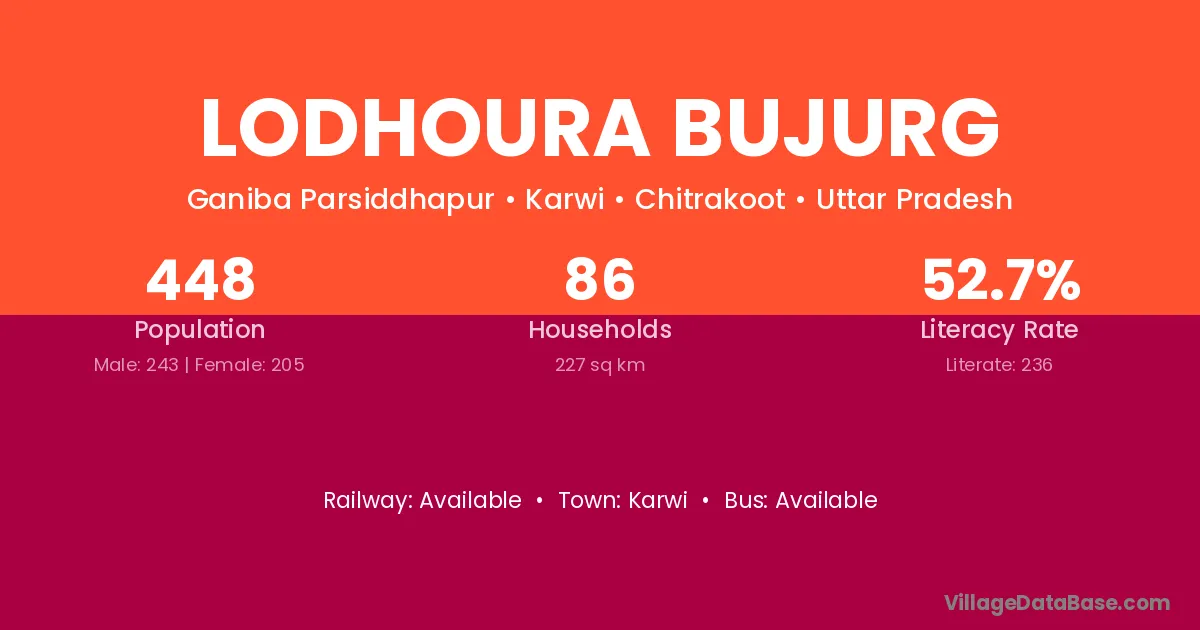 Lodhoura Bujurg village has a total population of 448 people, of which 243 are males and 205 are females.