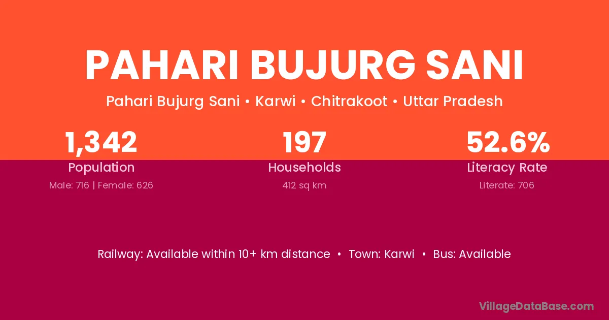 Pahari Bujurg Sani village has a total population of 1,342 people, of which 716 are males and 626 are females.