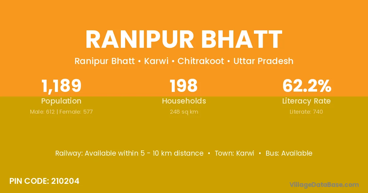 Ranipur Bhatt village has a total population of 1,189 people, of which 612 are males and 577 are females.
