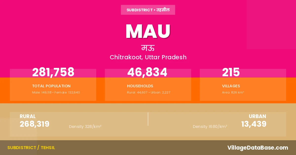 Mau is a town and Tehsil in the Chitrakoot district of the Uttar Pradesh. In India, a Tehsil is a subdivision of a district responsible for the administration and revenue collection of a specific area within the district. Tehsils play a crucial role in the local governance structure, contributing significantly to the development and administration of their communities.