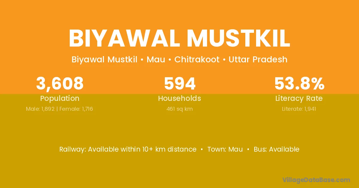 Biyawal Mustkil village has a total population of 3,608 people, of which 1,892 are males and 1,716 are females.