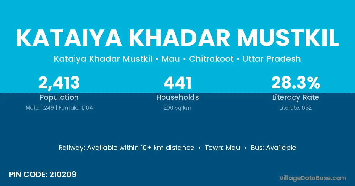 Kataiya Khadar Mustkil village has a total population of 2,413 people, of which 1,249 are males and 1,164 are females.
