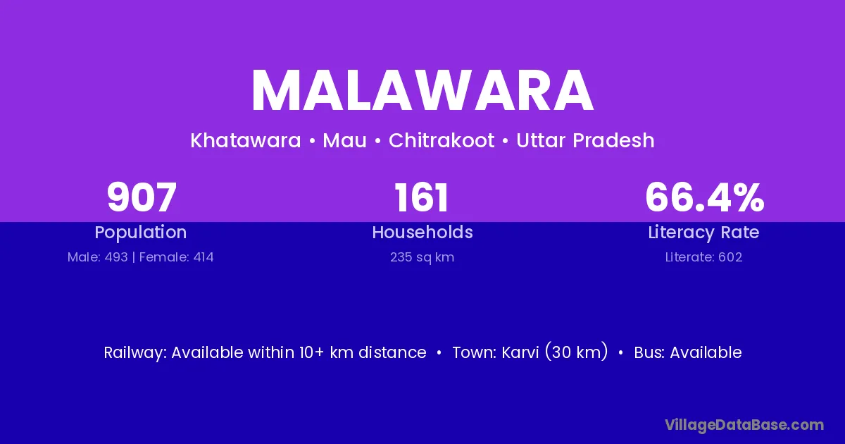 Karvi (30 km) is the nearest town to Malawara village for major economic activities and is located approximately 30 km away.