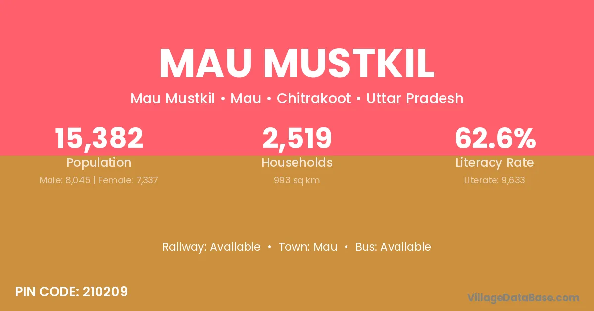 Mau Mustkil village has a total population of 15,382 people, of which 8,045 are males and 7,337 are females.