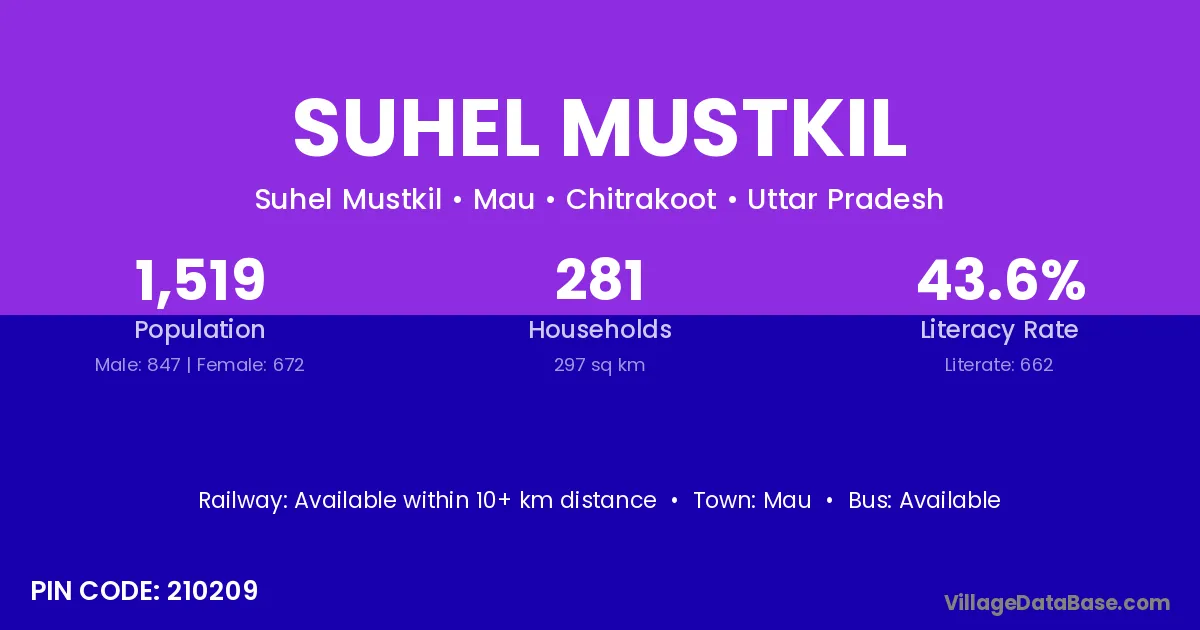 Suhel Mustkil village has a total population of 1,519 people, of which 847 are males and 672 are females.