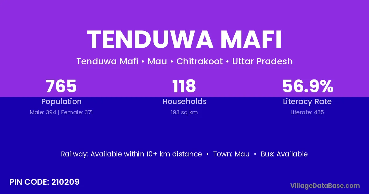 Tenduwa Mafi village has a total population of 765 people, of which 394 are males and 371 are females.