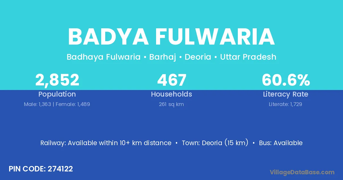 Deoria (15 km) is the nearest town to Badya Fulwaria village for major economic activities and is located approximately 15 km away.