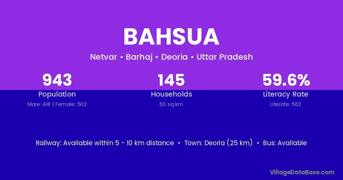 Deoria (25 km) is the nearest town to Bahsua village for major economic activities and is located approximately 25 km away.
