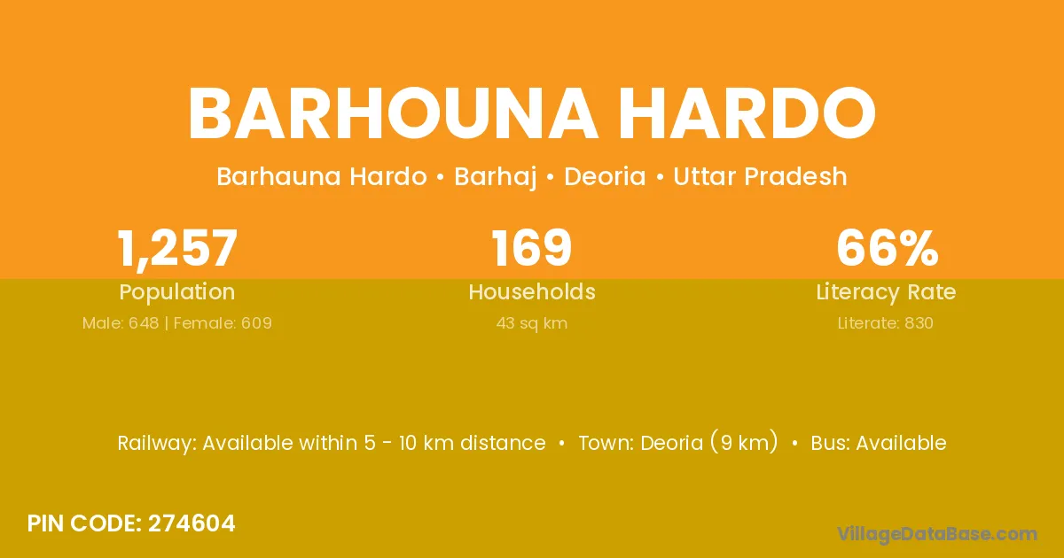 Deoria (9 km) is the nearest town to Barhouna Hardo village for major economic activities and is located approximately 9 km away.